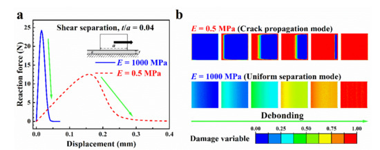(a) Force–displacement curves and (b) changes of interface damage variable during detachment for shear separation, for E = 0.5 and 1000 MPa (t/a = 0.04).