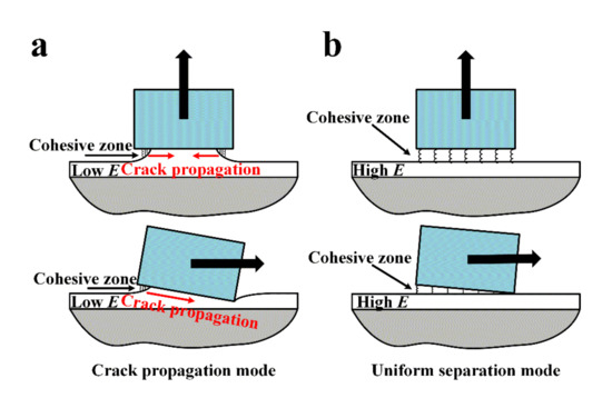 These two interfacial debonding modes for normal and shear separation are summarized schematically in Figure 10a,b. For the crack propagation mode (Figure 10a), the crack propagates from the edge to the center (normal separation) or from the left to right edge (shear separation) due to edge stress concentration, and Fc is determined mainly by the elastic modulus E of the film. For the uniform separation mode (Figure 10b), there is no obvious crack propagation, and Fc is determined mainly by the interface property (σmax of CZM).