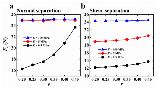 Figure 11 shows the 3D FE simulation results for Fc versus v for (a) normal separation and (b) shear separation for E = 0.5, 5, and 100 MPa (t/a = 0.04). For E = 0.5 MPa in normal separation and E = 0.5 MPa and 5 MPa in shear separation, Fc increases with v. This is because large v reduces the deformability and compliance of the film, resulting in higher Fc. For other E values, the Fc values are close to a2σmax (25 N). This is because the E and t/a values had already led interfacial debonding to a tendency to uniform separation mode (Fc ≈ a2σmax), obscuring the effect of v.