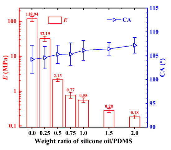 E and CA versus the weight ratio of silicone oil to epoxy/polydimethylsiloxane (PDMS).