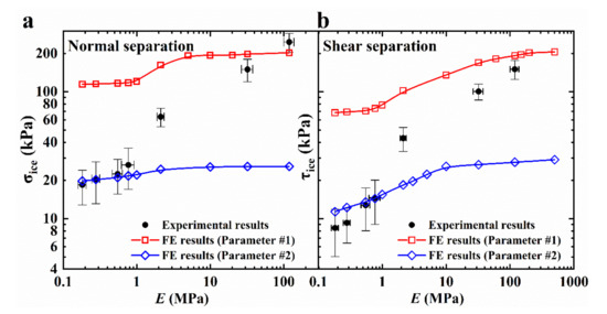As shown in this figure, the experimental results for σice and τice increase monotonically with E for both normal and shear separation. When E is 0.18 MPa, σice and τice are, respectively, 18.5 kPa and 8.5 kPa, which shows the good ice-phobic performance of low modulus epoxy/PDMS IPN gel coating. These values are much smaller than those of the coating with E = 119.0 MPa (σice = 246.6 kPa, τice = 150.7 kPa). In this section, the following two sets of CZM parameters were used for FE simulation results: parameter #1:Wad = 0.001 mJ/mm2, σmax = 0.2 MPa; parameter #2: Wad = 0.0001 mJ/mm2, σmax = 0.025 MPa. As shown in Figure 13a,b, the ascent phase of the FE results curve with parameter #2 matched the experimental results well when E < 1MPa for both normal and shear separation. This indicates that the interfacial debonding mode is the crack propagation mode. When E > 1 MPa, the FE results with parameter #1 only roughly match the trend of experimental results. In practice, the silicone oil not only reduces the E of epoxy/PDMS IPN gel but also, unavoidably, reduces Wad, σmax, and v. Therefore, FE simulation with a single CZM parameter cannot perfectly match the experiment.