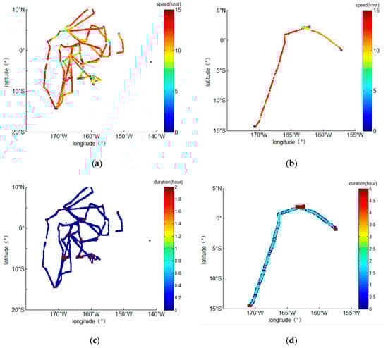 Figure 2 shows the movement track of a tuna purse seiner with MMSI number 338,539,000 on the sea surface and takes all AIS data of this vessel from January to May 2018. The image on the left shows all the data, while the image on the right shows the corresponding 15-day data from April 15 to 30. Figure 2a,b show the plane trajectory velocity, and Figure 2c,d show the spatial diagram of fishing intensity shown by the accumulated residence time of vessels. Figure 2a,b show that for the movement area of a single vessel, the high-speed trajectory points are the primary points, and the low-speed trajectory points are less common. Figure 2c,d show that the movement area is dominated by the track points of the vessel with a shorter stay time, the area where the vessel stays for a longer time is more concentrated, and the area involved is small.