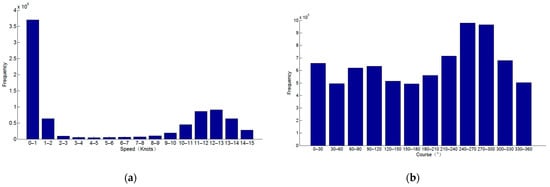 Interval distribution of speed and course: (a) Interval distribution of speed; (b) Interval distribution of course.