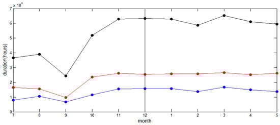 Time series chart of fishing effort by month: (1) The black broken line: the time invested by the vessels in all actions, including high-speed transiting and collecting nets for fishing; (2) The broken red line: the amount of fishing effort invested by the vessel transiting at high-speed to find or chase the fish; (3) The broken blue line:the amount of fishing effort invested by the vessels during low-speed purse seine operations.