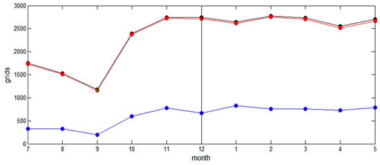 Figure 5 is a time series diagram of the coverage area of the vessel’s trajectory in each month. Based on the month, the 0.5° × 0.5° grid number under the fishing trajectory is added to describe the coverage area. The black broken line represents the coverage area of vessels under all actions, including high-speed transiting and collecting nets for fishing. The average monthly coverage rate is 27.2%. The broken red line represents the coverage area of the trajectories of vessels transiting at high speeds looking for fish or chasing fish, and the monthly average coverage rate is 26.9%. The broken blue line represents the coverage area of the trajectory of the vessel during low-speed purse seine operations, and the monthly average coverage rate is 7.1%. The coverage area of high-speed transiting and all behaviour states of vessels is similar, while the coverage area of purse seine operations is smaller.