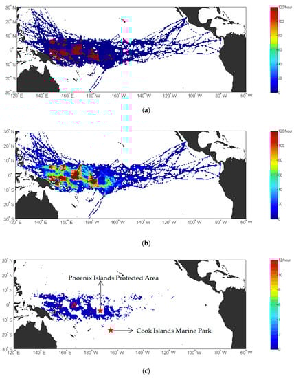 Tuna is an economically important species in pelagic fisheries. More than 50% of the world’s primary tuna production comes from the Western and Central Pacific []. The status of tuna resources has decreased from the historical high level, and tuna has become a hot spot of national and regional concern; thus, it is important to assess tuna resources for sustainable development and management. Resource assessment is an important part of fishery resource management; however, traditional resource assessment cannot quantify the fishing intensity of tuna fishery resources and living waters; thus, the management and monitoring of vessels are equally important. Due to the large area spanned by the oceans, it is not feasible for traditional vessels to perform full public supervision. Recent studies have shown that space behaviour can show hot spots of fishing activities and their relationship with external factors, and there have been certain relevant studies in offshore trawling fisheries [,].