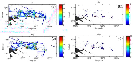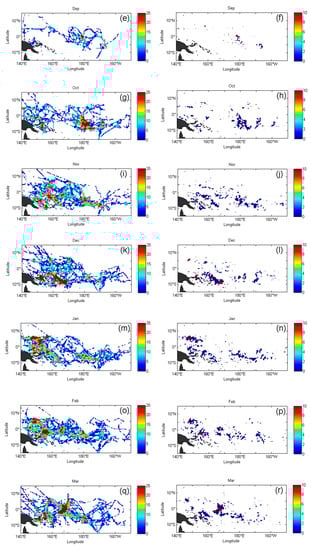 Figure 7a shows the images from July to December 2017, which shows vessels searching for fish in July was taken south of the equator between 150° E east longitude and 170° W west longitude. There are 4 high-intensity areas for finding fish, which are evenly distributed but small in area. The overall grid coverage rate is 20.1%, and the total time invested in the grid area of the tuna purse seine to search for fish schools reached 12,105 h. Figure 7b corresponds to a relatively discrete distribution of seine operating points. The primary concentrated area corresponds to the high-intensity area of fish hunting in Figure 7a. The grid coverage rate is 3.8%, and the time spent on purse seine fishing is approximately 5176 h. Figure 7c of finding fish in August is similar to that in July; however, the two high-intensity areas for finding fish near 165° E and 180° E longitude tend to expand north-south with a grid coverage of 17.6%. Additionally, the total time invested in finding fish schools equalled 10,414 h. Figure 7d of purse seine fishing operations has a corresponding expansion trend compared to that of Figure 7b. The grid coverage rate is 3.8%, and the total time of purse seine fishing operations equals 6015 h. In September, Figure 7e of finding fish and Figure 7f of purse seine fishing operations are located near the equator at 180° E east longitude. There is a marked high-intensity fish-finding area and a high-intensity fishing area. The grid coverage is 13.5% and 2.2%, and the total investment times are 5830 and 3604 h, respectively.