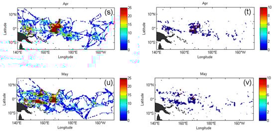 Analysing the images from January to May 2018, looking for fish in Figure 7m at 10° N to 10° S latitude area and 140° E–160° E east longitude, and 10° S south of the equator and 180° E east longitude in January, there are marked scattered areas with high intensities for fish hunting. In this image, the grid coverage rate is 30.4%, and the total investment time for finding fish schools is 20,935 h. In Figure 7n of purse seine fishing, there is a high-intensity fishing area near 5° S south latitude and 150° E east longitude. Compared with the fishing image of December 2017, the high-intensity fishing area near 10° S south latitude disappeared, and the area in the fish cluster changed. The image grid coverage of purse seine operations in January is 9.6%, and the total fishing investment time is 12,600 h. In February, looking for fish in Figure 7o, a high-intensity fishing area located near the equator and east longitude 165° E–170° E occurred in January. The overall search for fish trajectory area is more concentrated, the grid coverage rate is 32%, and the total investment time for finding fish schools is 21,123 h. In Figure 7p, the high-intensity area for purse seine operations is similar to the high-intensity area for fish hunting, the grid coverage rate is 8.8%, and the total fishing investment time is 10,103 h. In March, in the fish hunting as show in Figure 7q, the high-intensity fish hunting area was originally located near the equator and east longitude 165° E–170E but expands to the north-south direction, and the other high-intensity fish hunting areas decrease in intensity. The grid coverage rate is 31.5%, and the total investment time for finding fish is 21,706 h. In Figure 7r of purse seine operations, there is a marked high-intensity fishing area located near the equator at longitude 165° E–170° E east. The grid coverage rate is 8.8%, and the total fishing investment time is 12,932 h. In April in Figure 7s, the fish-finding high-intensity area near the equator and east longitude 165° E–170° E continues to expand along the east-west direction. The high-intensity fishing area in purse seine operation Figure 7t also increases in size accordingly. The grid coverage of the fish hunting and fishing images is 29.2% and 8.5%, respectively, and the investment times are 20,152 and 11,871 h, respectively. In May in the fish hunting Figure 7u, the high-intensity fish hunting areas are primarily concentrated from 5° S to 5° N and 140° E–170° E. However, the high-intensity fish hunting area near the equator and east longitude 165° E–170° E decreases, the grid coverage rate is 30.9%, and the total time for fish hunting is 21,894 h. In Figure 7v of purse seine operations, the high-intensity fishing area originally located in Figure 7t decreases, the grid coverage rate is 9.2%, and the total fishing investment time is 10,628 h.