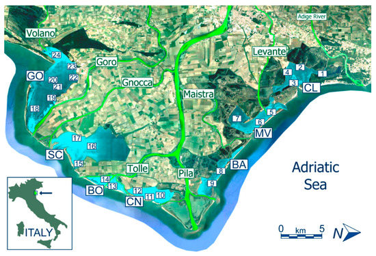- Verza, E.; Cattozzo, L. Atlante Lagunare Costiero del Delta del Po; Regione del Veneto, Associazione Culturale Naturalistica Sagittaria, Consorzio di Bonifica Delta del Po: Taglio di Po-Rovigo, Italy, 2015; pp. 1–341. (In Italian) [Google Scholar]