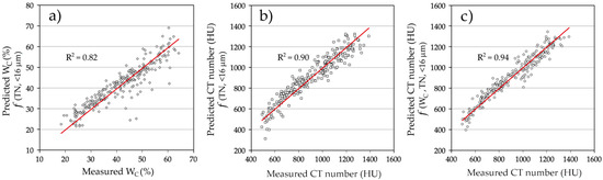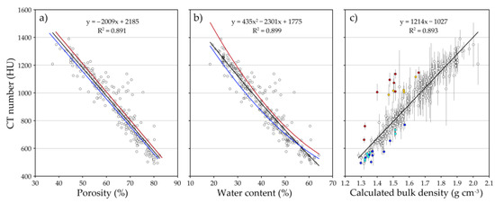 As shown in Figure 5a, the CT number depends inversely and linearly on porosity (Φ), with the determination coefficient similar to the coefficient found for the CT number–bulk density relation. This is because porosity is calculated from the measured WC and the estimated mean sediment particle density (ρp), combining Equations (3) and (5). Although calculated porosity explains 89% of the CT number variability, other factors must significantly contribute to some data points’ considerable deviations from the best fit. It is evident that the uncertainty of ρp cannot explain these deviations, as shown by the blue and the red regression lines depicting the linear relations, assuming the mean specific density of sediment particles fixed at 2.5 and 2.8 g cm−3, respectively. This range of the mean density of particles is likely valid for all samples examined in this study. Fortin et al. [32] reported a determination coefficient (R2) of 0.83 for the linear regression CT number versus porosity (calculated from wet and dry bulk density), comparable to R2 = 0.89 in this study. They observed that the correlation was weaker for lower porosity and attributed this tendency to the errors in the discrete sampling for bulk density measurements; in fact, these errors correspond to a percentage of the mass per cubic centimetre and hence they increase in denser samples.