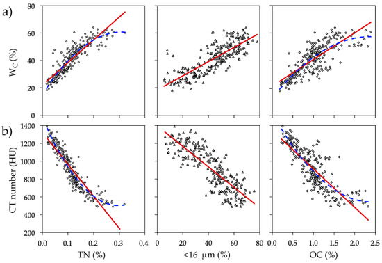Contents of total nitrogen (TN), <16-μm grain-size fraction (<16 μm) and organic carbon (OC) plotted against (a) water content and (b) CT number. Linear regression (solid lines), and for TN and OC, second-degree polynomial fit (broken line) correspond to regression coefficients shown in Table 3.