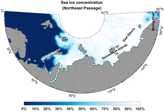 The Arctic is covered by sea ice throughout the year, which plays an important role in global climate regulation [1]. However, in recent decades, the area covered by sea ice in the Arctic has been declining. An increase in temperature causes the sea ice to melt, which then causes the sea surface albedo to decrease and solar radiation absorption to increase, and the temperature to continue to rise [2,3]. Changes in sea ice coverage affect the global transportation industry. For example, with the reduction of sea ice coverage, the possibility of navigation in the Arctic is gradually increasing. In particular, the Northeast Passage is becoming navigable in summer [4].