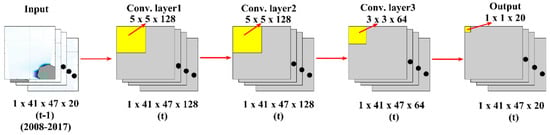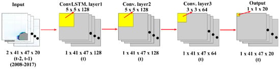 The dimension in Figure 3 is sequence × height × width × channel. Based on the SIC data of the previous moment (), the feature map of the next moment () is extracted by a three-layer convolution calculation. The first three layers contain 128, 128, and 64 filters, respectively, while the output layer contains 20 filters, which is the same as the number of input data patches. The kernel size of the first two convolutional layers is 5, and that of the third layer is 3; i.e., the faster changes are extracted first, and the subtle changes are then learned [22].