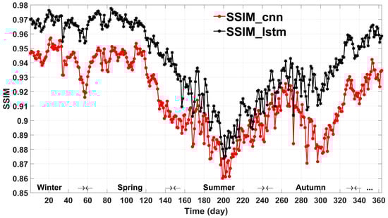 In this study, the prediction accuracy of the two models was evaluated by comparing the daily SSIM from 3 January to 31 December. During the initial operation of ConvLSTM, the data of 1 January and 2 January should be input to predict 3 January. Therefore, the earliest start time of the prediction is from 3 January. The calculated SSIM is shown in Figure 6.