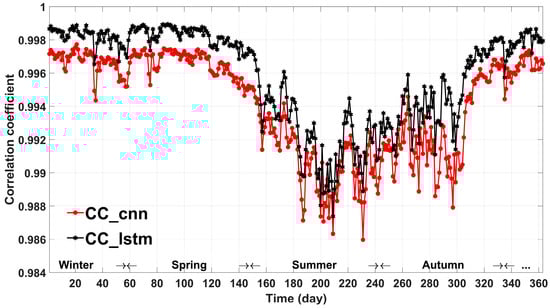 Figure 7 shows the CC of the CNNs and ConvLSTM for the 363 days. The overall CC of ConvLSTM exceeded that of the CNNs. The CC of ConvLSTM reached approximately 0.999 during the winter, while the highest CC of the CNNs was 0.997. During the summer, the CC of ConvLSTM was lowest, at approximately 0.987, and the lowest CC of the CNNs was approximately 0.986. Table 3 below shows the maximum, minimum and average CC of ConvLSTM and CNNs.