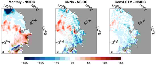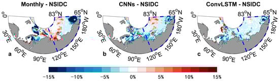 The anomalies between different results and the NSIDC SIC of 15 December 2018 were calculated in the way of monthly average minus NSIDC, CNNs daily prediction minus NSIDC, and ConvLSTM daily prediction minus NSIDC. The results are depicted in Figure 8 for December.