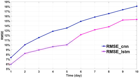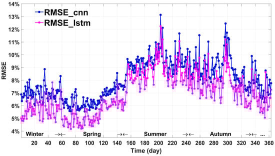 Comparison of the daily root-mean-squared-error (RMSE) between the CNNs and ConvLSTM. The magenta line in the figure represents the RMSE of ConvLSTM, and the blue line represents the RMSE of CNNs.