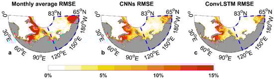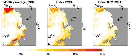- The RMSEs of the CNNs and ConvLSTM for the tested 363 days are compared in Figure 10. The RMSE of ConvLSTM was always lower than that of the CNNs. The highest RMSE of ConvLSTM is was 12.235%, and the lowest was 4.174%; the highest RMSE of the CNNs was 13.134%, and the lowest was 5.547%. The spatial distribution map of the RMSE in the Northeast Passage also showed that the monthly average results were the worst among the three, and ConvLSTM had the best prediction accuracy, particularly in the vicinity of the East Siberia Sea area.