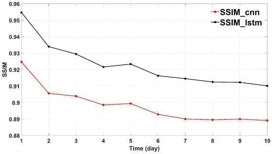 - In this study, the predictability of the CNNs and ConvLSTM was compared, and the SSIM and RMSE of the two were calculated through ten consecutive days of iterative prediction (Figure 13 and Figure 14). The average SSIM of the CNNs in these 10 d was 0.898, and the RMSE was 13.799%, while the average SSIM of ConvLSTM was 0.923, and the RMSE was 11.238%. According to the comparison results, the predictability of ConvLSTM was significantly better than that of the CNNs.