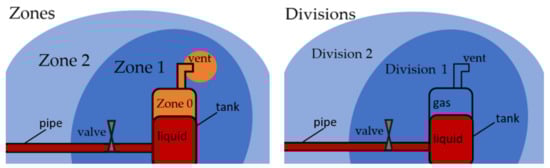 Historically, the National Electrical Code (NEC), established in 1947 as a concept of areas with two Divisions, followed by the American Petroleum Institute (API), which started related work in 1951 on its area classification document API500 based on Divisions (API500A for electrical installations in petroleum refineries was finalized in 1955, initially without the suffix “A;” API500B for electrical installations at drilling rigs and production facilities on land and marine platforms was finalized in 1961; and API500C for electrical installations at pipelines was finalized in 1966. These merged in 1991 into a single API 500 document []). API 500 is based on a hazardous area classification based on two Divisions, while API 505, introduced in 1997 [], is based on three Zones (both the ATEX and IECEx schemes are based on Zone classification) [] (Table 5 and Figure 1). After these early efforts, which were made in the USA and followed by many countries, the first international system for protection against explosions is dated in 1996 when IECEx was established and in 2003 when the first certificates were issued (IEC-60079-10-1 is compatible with US API 505 for the classification of hazardous areas). In Europe, the history of ATEX directives started also in the 1990s.