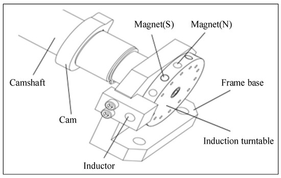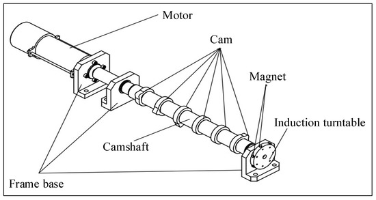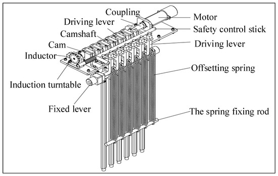 The spring-triggered opening and closing structure (Figure 3) includes a frame, a 60 W brushless DC motor, a camshaft with six cams, three nets, six net port levers, an induction turntable with 14 magnets (magnetic N and S poles are installed crosswise), a sensor, and a locking mechanism with six paddles.