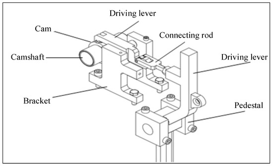 The three net ports are four-sided when they are opened. Two sides are fixed on the trawl support rods, and the other two sides are fixed on two net port levers (one is the opening lever and the other is the closing lever). In the driving mechanism of the opening and closing net (Figure 4), the motor is connected to the camshaft through a coupling, and six cams and an empty station are evenly distributed on the camshaft. The other end of the camshaft is connected to the sensing structure (Figure 5), and the sensor is installed on the sensing plate. The locking mechanism (Figure 6) is fixed on the frame, one end is in contact with the cam, and the other end is locked by the hook. The six levers are fixed on the frame through the middle hole to form a lever mechanism. The other side is connected to the frame by a spring, and the spring is in a stretched state in a non-working state.