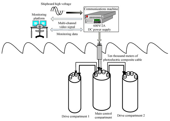 The monitoring system of the visible collector mainly includes a deck monitoring unit, an optical cable communication machine, an underwater optical fiber communication module, an embedded control system main board, and driving cabins. The system structure diagram is shown in Figure 9.