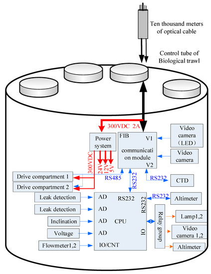 The principle block diagram of the main control cabin is shown in Figure 10, which mainly shows the transmission of direct current, the detection of water leakage, inclination, and flow conditions, the switch control of underwater lights, underwater cameras and bottom altimeters, and the upload of underwater video signals and underwater data.