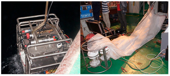 The multi-net visible zooplankton collector was set up in two sampling stations with water depths exceeding 3000 m in the Northwest Pacific. The sampling device was tested on deck before launching. Through the photoelectric composite cable, the following were carried out: communication test, network port opening and closing test, ball valve opening and closing test, and the altimeter, camera lighting system, flowmeter detection and other functional testing tests. After the research vessel arrived at the predetermined station, its course was adjusted to the top wind and top current, maintaining a speed of 1.5–3 knots with straight sailing. The cable was unwound at a speed of about 30 m/min to a depth of 3000 m, and then the cable was slowly unwound to a distance of 5–10 m from the seabed, after which the cable laying was terminated. The following steps were conducted: Turn on the CTD and other sensors to record and synchronize environmental data during the unwinding process. Keep the speed and heading stable during the near-bottom operation. Turn on the camera and underwater lights, as well as the video and data recording system.