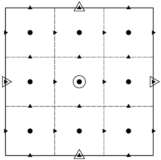 A coarse grid cell divided into nine fine grid cells with the refinement ratio of 3 in both horizontal directions and variable distributions on a C-grid. The coarse-resolution grid (CRG) variables and high-resolution grid (HRG) variables are represented by the hollow and solid symbols, respectively.
