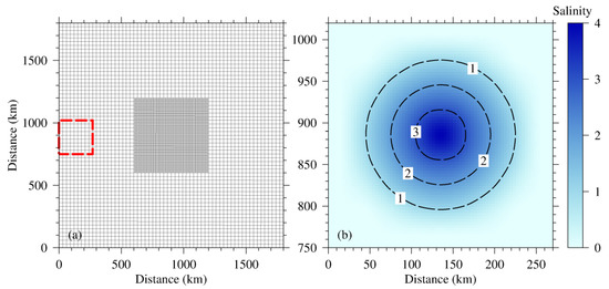 (a) numerical domain of the nested grid. (b) The initial salinity distribution of the ideal experiment in the area indicated by the red dashed line box in (a).
