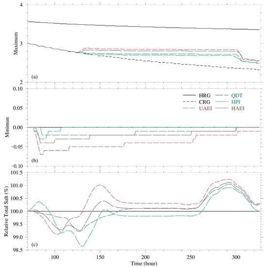 The maximum, the minimum, and the sum of the salinity field are used to evaluate the performance of each interpolation scheme. The maximum indicates the peak preservation skill, and the minimum value shows the oscillations introduced by the interpolation process. Total salt of the whole numerical domain can measure the conservation properties of each scheme. Figure 5 illustrates time series of the three indices for all six cases. The saline water mass reaches the western nesting interface at about hour 94, while completely leaves the refined domain at hour 327 approximately. The maximum value declines due to numerical diffusion. However, the CRG case shows a faster decreasing rate than the HRG one because the numerical diffusion is smaller in the HRG than in the CRG. As seen in Figure 5a, the nested grid solutions exhibit strong ability to retain the salinity peak due to the increased resolution after the scalar distribution is advected to the fine-grid subdomain. The two AEI schemes result in an overshoot of the maximum, which is indictive of poor performance of interpolation scheme, whereas the QI scheme and HPI scheme present better continuity during transition from the coarse-grid subdomain to the fine-grid subdomain.