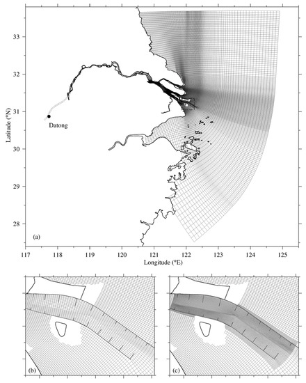- Xiang, Y.; Zhu, J.; Wu, H. The impact of the shelf circulations on the saltwater intrusion in the Changjiang Estuary in winter. Prog. Nat. Sci. 2009, 19, 192–202. [Google Scholar]