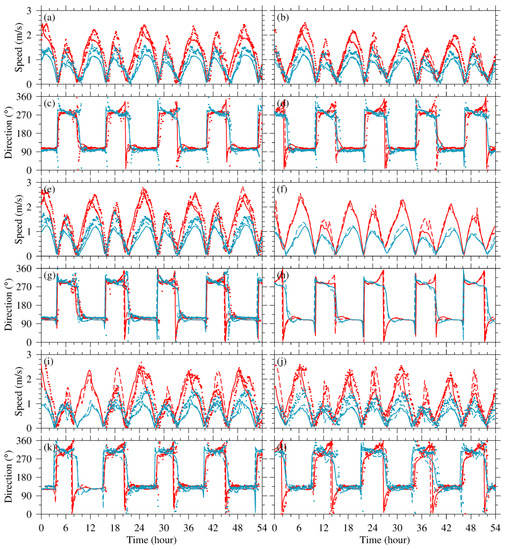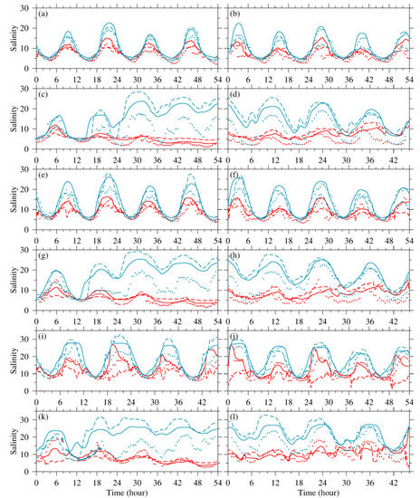 Time series of salinity obtained from the observed data (dots), Exp. 0 (solid lines) and Exp. 3(dashed lines) at sites A (a–d), B (e–h), and C (i–l) during four tidal phases (spring: a, e, i; MTAS: b, f, j; neap: c, g, k; MTAN: d, h, l). Red indicates surface and blue indicates bottom.
