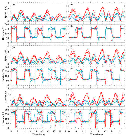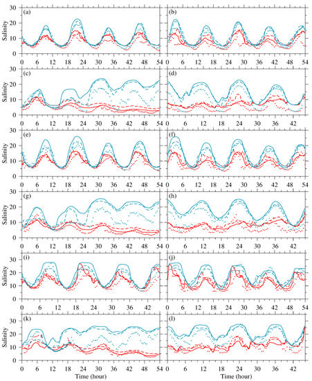 Figure 13 illustrates the salinity variance of measured data, Exp. 0 and Exp. 5 at three observational sites during the survey periods. Compared with salinity variance in Exp. 3 (Figure 12), the surface salinity of the new experiment increased, while the bottom salinity decreased, which indicated that the nested grid solution was much more consistent with the reference solution. The blue dashed line went under the solid line in Figure 13c,d,g,h,k,l, which meant that the results of Exp. 5 were closer to the observed salinity at the bottom layer during the neap tide and MTAN. Basically, the model reproduced the salinity variances at three sites much better without enforced conservation.