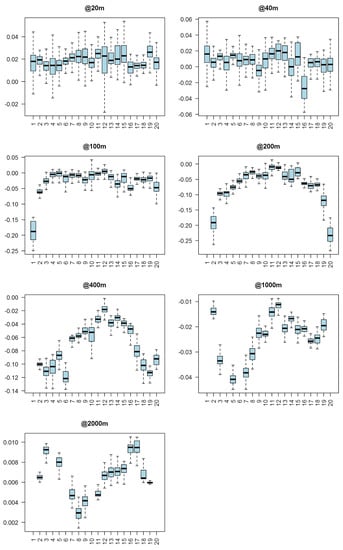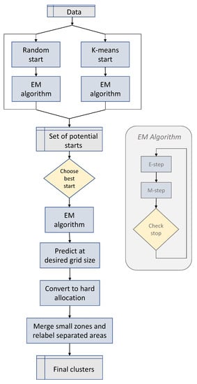 An overview of the clustering process is given in Figure 1. The EM algorithm requires starting values. We used a combination of 100 random starts and 100 k-means to initialise the algorithm. Each start was run for a set of 100 initial iterations and the start that gave the best fit (highest likelihood) was chosen, and 1200 further iterations were done to refine the result. The number of clusters was fixed at 20. This model was fitted using the 10 × 10 km data and was then used to predict/allocate cluster labels for a finer 5 × 5 km grid. This allowed for efficient and fast model fitting while producing a fine scale over a large area. In post-processing, spatially disjoint areas were identified using the image analysis function connectedComponents from the Rvision library, which is based on OpenCV [] and disjoint areas were then assigned different zone labels. Finally, any spatial zone less than 30,000 km2 in area was combined with the neighbouring or surrounding zone that was predicted most likely by the mixture model’s posterior probabilities. This size limit corresponds to a radius of just under 100 km, which is often the maximum range over which sound is propagated in noise maps (e.g., [,]).