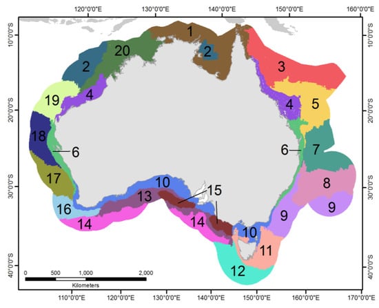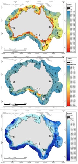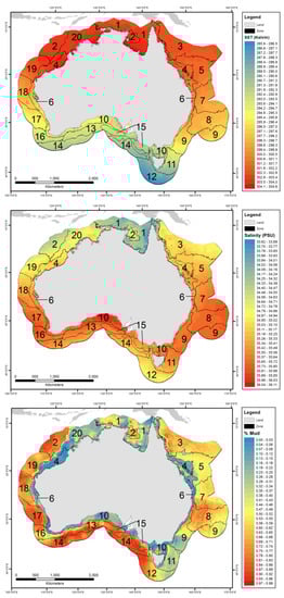 The inshore continental shelf was characterised by shallow water with a sandy seafloor, and included five of the twenty zones—1, 4, 6, 10, and 20 (Figure 5, %Sand). Among these zones, there was an expected latitudinal difference in the more dynamic variable of sea surface temperature, and to a lesser extent sea surface salinity. Sea surface temperature ranged from hot (tropical) in the North to cold in the South (Figure 5, SST). Salinity was lowest in the Gulf of Carpentaria and highest at temperate latitudes (Figure 5, Salinity).