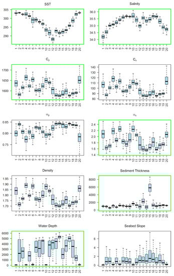 Box-and-whisker plots of various variables by zone (x-axes show zone number): Sea surface temperature (SST) [kelvin], sea surface salinity [psu], compressional sound speed at the seafloor (Cp) [m/s], shear sound speed at the seafloor (Cs) [m/s], compressional absorption coefficient at the seafloor () [dB/λ], shear absorption coefficient at the seafloor () [dB/λ], density of the top seafloor layer [1000 kg/m3], thickness of the unconsolidated and consolidated sediment [m], water depth [m], and seabed slope [degrees]. Variables used directly in the clustering model are in green boxes.