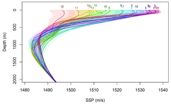 Sound speed profiles representative of the month of July, coloured by zone. The mean profile for each zone is drawn as a line on top of all profiles within that zone, which are merely shaded.
