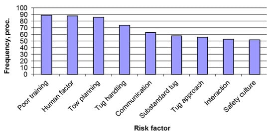 Today, the tugs operated in ports are of a different type and capacity and mostly depend on ship size and port-external conditions (wind, waves, current and shallow water). The main risks at ports, which are pointed out by some authors, can be classified as follows: poor ship and port staff knowledge and training; the human factor in general; poor maintenance of port tugs; poor communication between all players during a ship’s arrival at or departure from the port, as well as mooring operations (in the case that the ship’s crew, port pilot and tugs masters communicate in different languages); poor or outdated tug equipment; poor safety culture, etc. [3,8,10,11,12,13]. According to Indian researchers [11], the risk factors and frequency at Indian ports are presented in percentages in Figure 1 below.