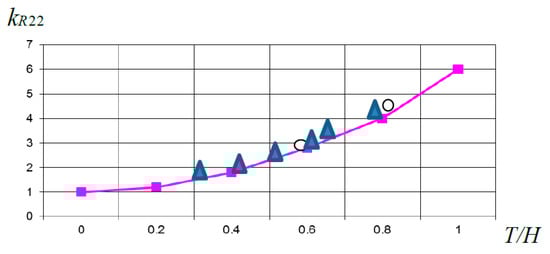 Studies of Formulas (13) and (14) obtained by the regression method revealed that the errors of the searched values using regression formulas in comparison with the results of experiments performed on real ships [19,40] do not exceed 5–7%.