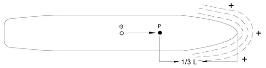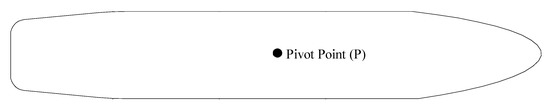 The towing force shoulder can be found using the abscissa of the ship’s turning pivot point () (Figure 4, Figure 5 and Figure 6) and towage rope length (). The pivot point of the ship depends on the ship’s movement direction, which means that the ship is moving ahead or astern and can be calculated as follows [16,50]: