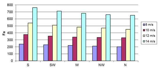 where —thrusters coefficient in X direction, which could range from 0.01 to 0.1 depending on the thruster’s installation position on ship; —thruster’s force in X direction can be taken from thruster’s specification; —ship effectiveness depending on thruster’s speed, in many cases falling within 3–4 m/s; —ship’s speed, which could range from 0 to ; —thruster’s coefficient in Y direction, which could range from 0.8 to 1.0 depending of the thruster’s installation position on the ship; —thruster’s force in Y direction can be taken from thruster’s specification; —thruster (s) transverse force shoulder.