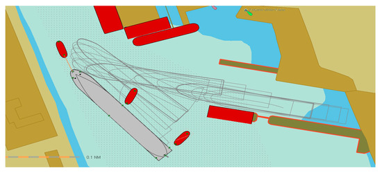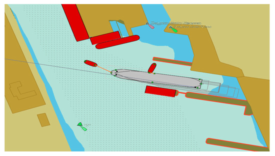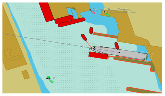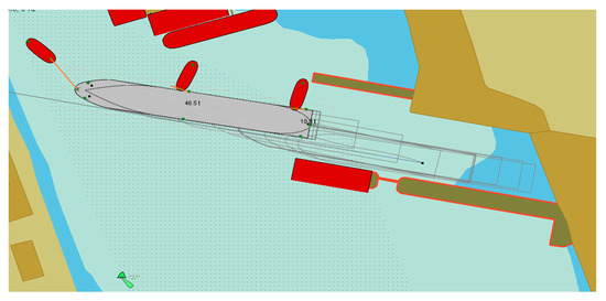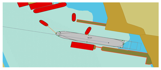where —inertia forces and the moment; forces and moment created by the ship’s hull () could be calculated by using the methodology stated in [51,52,53]; —the ship’s hull as the acting “wing”-related forces and the moment could be calculated using the methodology stated in [50]; —forces and the moment created by the ship’s rudder or other steering equipment; —forces and the moment created by thrusters; —aerodynamic forces and the moment could be calculated using the methodology stated in [52,53]; —forces and the moment created by the current could be calculated using the methodology stated in [6,26]; —forces and the moment created by waves could be calculated using the methodology stated in [51,52,53]; —forces and the moment created by shallow water effects; —forces and the moment created by ship’s propeller (propellers) could be calculated using the methodology stated in [51,52,53]; —forces and moment created by tugs. Additional forces and moments could be created by anchor or mooring ropes or other factors.