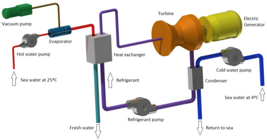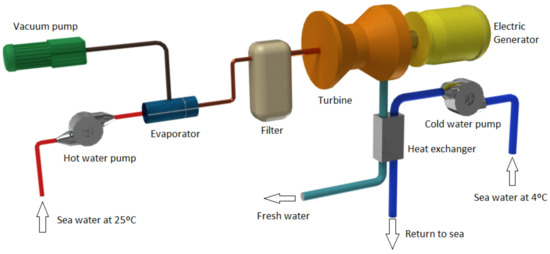 An open-cycle OTEC system uses a vacuum for its operation; vacuum is the condition that occurs inside a closed cavity when the pressure of the air or other gases is close to absolute zero. Figure 1 shows the scheme of an open cycle, where the surface water is pumped first into a vacuum chamber that operates between 1 and 3% of the atmospheric pressure [25]; the pressure drop rapidly evaporates the water. It should be noted that the salt and other seawater components remain in the vacuum chamber; therefore, this is a freshwater vapour. This vapour passes through a low-pressure turbine which, in turn, is connected to an electric generator. Apart from producing electricity, this technology also produces desalinated freshwater, which is suitable for drinking water, irrigation, or aquaculture [26].
