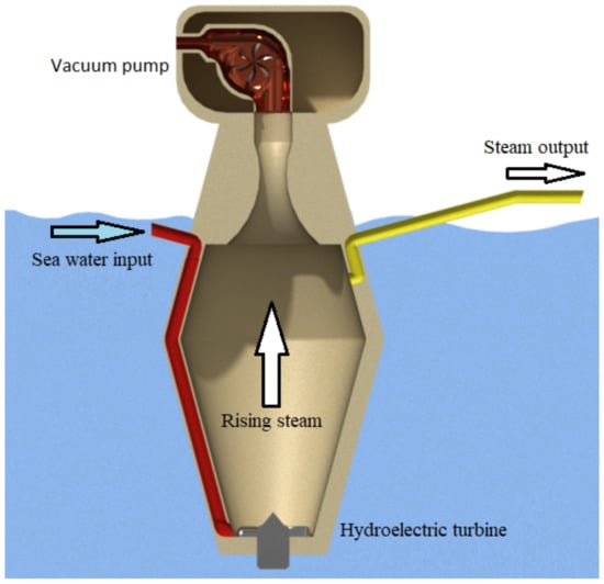 Another mode to operate an open-cycle OTEC is using a Mist Lift system, which replaces the steam turbine with a hydroelectric turbine, as shown in Figure 2. In Mist Lift systems, a floating concrete container is used, large part of the structure of which is submerged underwater. A hydroelectric turbine located at the base of the structure generates electricity. This turbine is fed by large amounts of warm seawater, which fall by gravity from a height of approximately 100 m [35]. Mist lift systems are so named because of the water lift technique used, consisting of reintegrating the water into the structure’s upper part. The hot water on the surface boils due to the partial vacuum inside the container, creating a great magnitude of rising steam. At a height greater than 20 m, cold seawater flows are sprayed within the steam, retracting quickly and creating a lower pressure. This pressure difference between the base and the upper part of the structure generates a mist of multiphase steam, which comes out of the upper part of the structure at high speed [36].