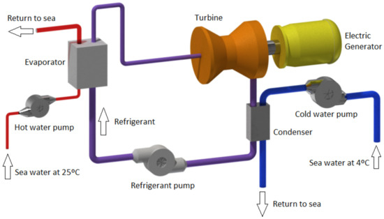 In the 1880s, Jacques D’Arsonval, based on the Rankine thermodynamic cycle, first proposed closed-loop OTEC technology [82], for use in tropical oceans. The proposed system uses a stream of ammonia that passes through two heat exchangers (evaporator and condenser). To do this, it uses the difference in temperature between surface water and water found at high depths (i.e., greater than 800 m) as an energy source. The cycle begins by using the first heat exchanger to evaporate the pressurized ammonia. Then, the steam generated is used to drive an electric turbine. The next cycle is achieved with cold seawater and the second heat exchanger, which is responsible for condensing the ammonia vapour.