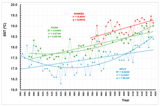 Time series of the mean annual SST measured at Split, Hvar, and Komiža stations. The r2 and R2 represent the r–squared values of the correlation coefficients of the linear and quadratic regressions, respectively, and p represents the Mann–Kendall (M–K) test values.