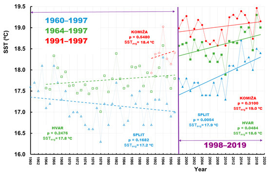 Time series of the mean annual SST measured at Split, Hvar, and Komiža stations. SSTavg is an average value of the mean annual SST, and p represents M–K test values, calculated for two sub–periods defined by the results of Rescaled Adjusted Partial Sums (RAPS) method.