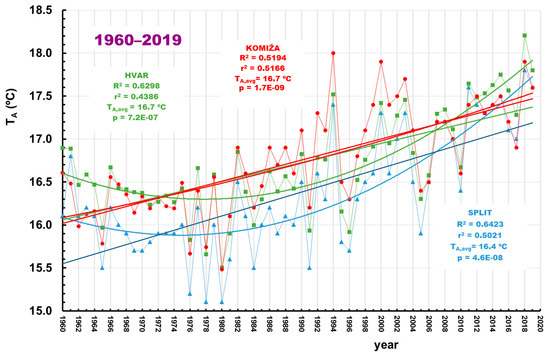 Time series of the mean annual air temperature measured at Split, Hvar, and Komiža stations. The r2 and R2 represent the square values of the correlation coefficients of the linear and quadratic regressions, respectively, and p represents M–K test values. TA, avg is the average value of the mean annual air temperature in the investigated period.